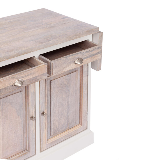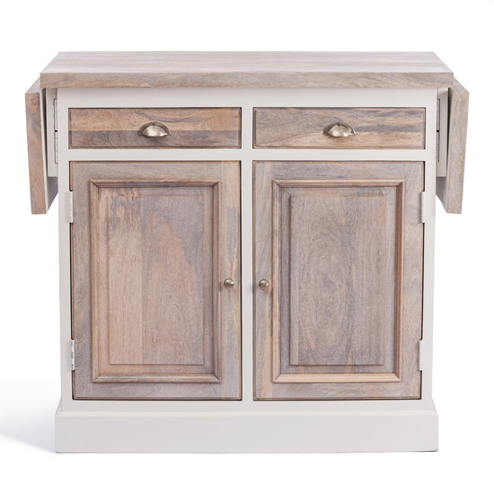 Кухонный остров Secret De Maison из коллекции RIVIERA станет неотъемлемым украшением кухни в вашем загородном доме или городской квартире. Модель прекрасно впишется как в классический, так и в современный интерьер. Надежный каркас кухонного острова выполнен из акации. Он долговечен, прочен и основателен. Столешница, ящики и дверцы модели изготовлены из натуральной древесины манго. Такой материал не требует дополнительного ухода, устойчив к воздействию влаги и тепла, сохраняет свой первоначальный внешний вид на протяжении длительного времени. Пространство для приготовления и приема пищи можно увеличить при помощи специального раскладного механизма. Кухонный остров с дополнительными местами для хранения обеспечит максимальный комфорт и удобство. В ящиках можно разместить столовые приборы, а на полках – крупы или посуду. Фактура состаренной натуральной древесины видна по всем поверхностям изделия. Модель отличается красивой комбинацией цвета – античного белого цвета и натурального дерева с эффектом состаривания. Оригинальный дизайн, крепкое основание, надежный раскладной механизм, вместительные секции для хранения, прочная столешница кухонного острова Secret De Maison будут доставлять удовольствие и восхищать своего владельца долгие годы.