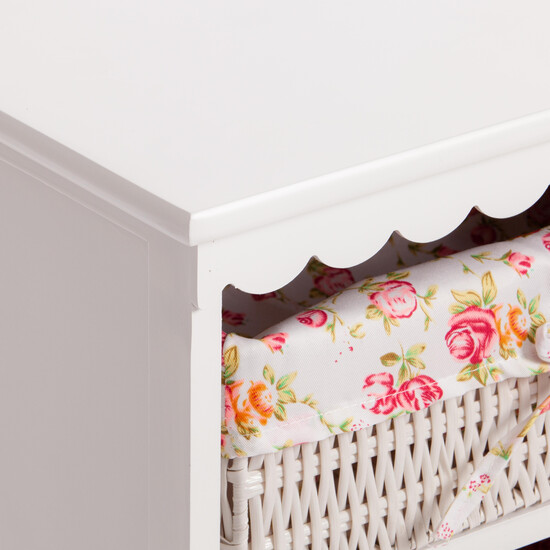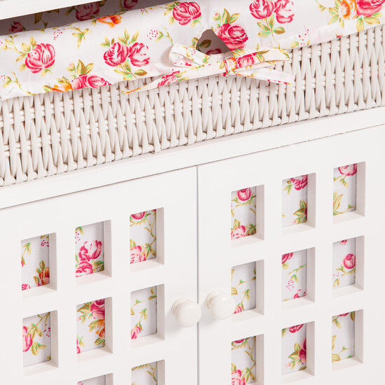 Одновременно компактный и вместительный комод Secret De Maison LE RAY из коллекции SAINT-TROPEZ станет прекрасным местом для хранения различных вещей. Комод будет хорошо смотреться в гостиной, спальне, коридоре, ванной. Две плетеные корзины из бумажного жгута и вместительное отделение с дверцами помогут организовать порядок в любой части квартиры. Сочетание прочного каркаса из массива павловнии, покрашенного в белый цвет, корзин из бумажного жгута и съемных тканевых чехлов с нежным цветочным принтом не оставит никого равнодушным. Натуральная древесина павловнии обладает хорошими водоотталкивающими свойствами, благодаря чему изделие долговечно, надежно и не требует специального ухода. Модель отлично сочетается с мебелью из коллекции SAINT-TROPEZ, поставляется в собранном виде.