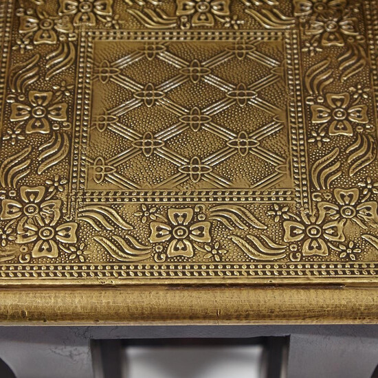 Уникальный комплект из 3-х столиков разного размера Secret de Maison BRAHMA, выполненный индийскими мастерами, добавит ноты индивидуальности в ваш интерьер. Удивительная красота и качественная ручная работа выделяют столики среди привычной мебели. Изысканная форма, использование натуральных материалов, столешницы с отделкой под латунь и чеканкой ручной работы подчеркивают неповторимый облик изделий. Компактные размеры, легкий вес и простота конструкции позволяют использовать столики, как по прямому назначению, так и в качестве подставок под цветы, табуретов, дополнительной сервировочной поверхности. Столики удобно ставятся один под другой, не занимают много места при хранении. Каркас изделий изготовлен из массива дерева манго, он практичен, надежен, прост в уходе и прослужит долгие годы, сохраняя свой первоначальный вид. Комплект относится к коллекции ANTIQUE CLOCKS, поставляется в собранном виде.