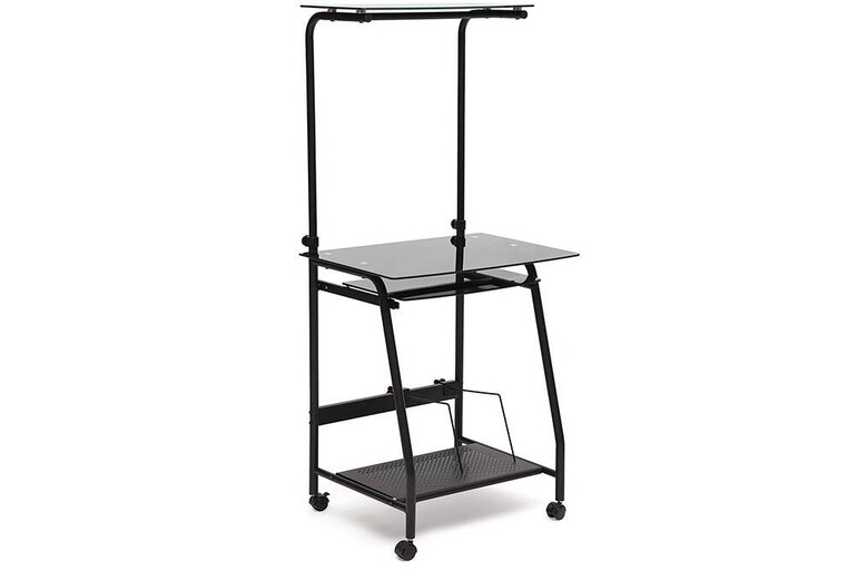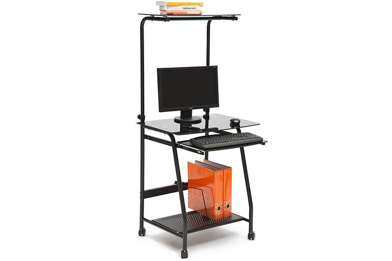 Минималистичный компьютерный стол шириной 65см., конструкция которого предусматривает наличие полки под принтер и подставки под системный блок. Металлический каркас стола выполнен в ярко-черном или нежно-серебристом цвете, стол подойдет и для офисного и для домашнего интерьера
