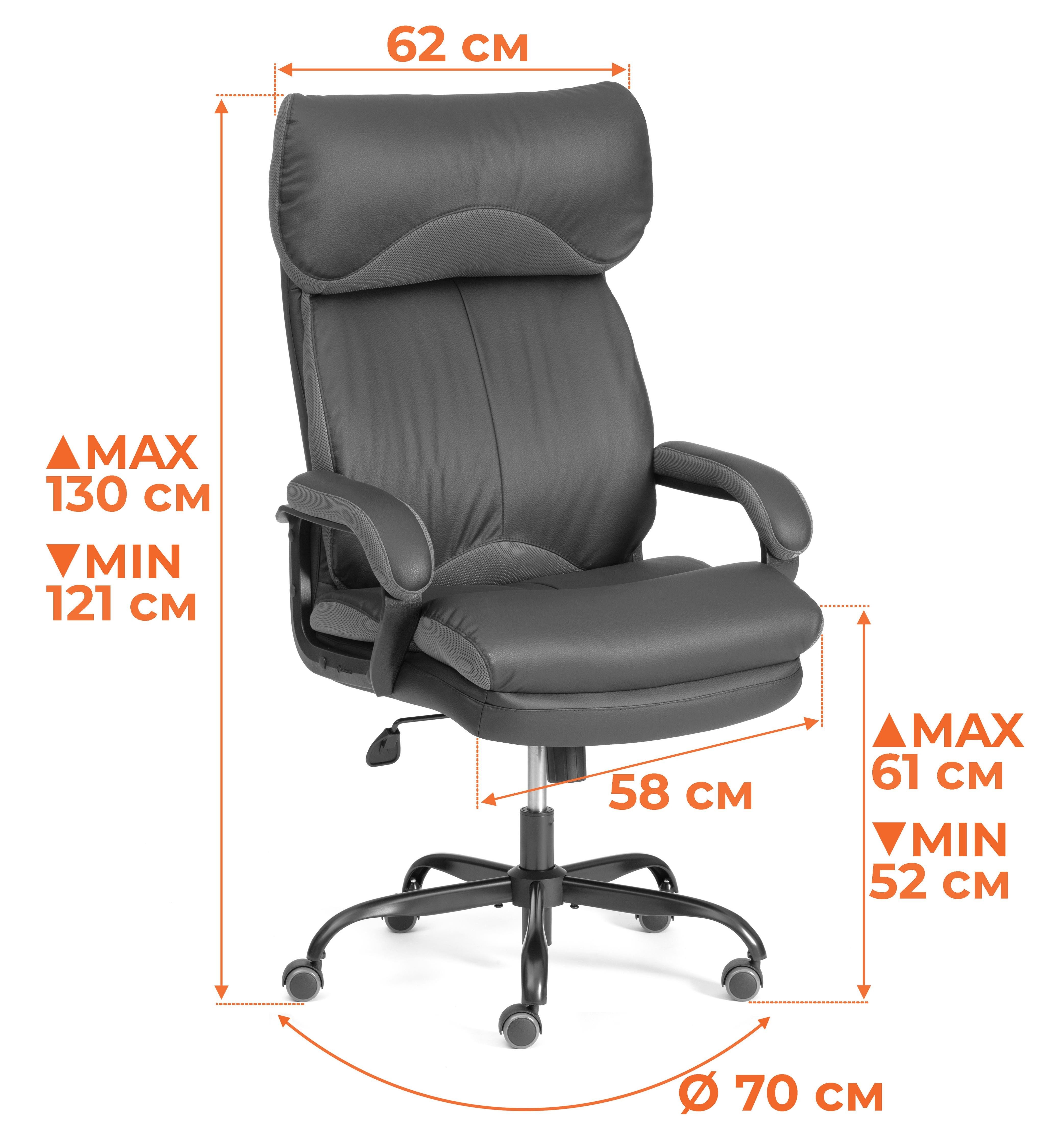 Эргономичная спинка, прочный каркас, мягкое сиденье компьютерного кресла DUKE metalBL - воплощение элегантности, практичности и солидности. Модель отлично впишется в дизайн рабочего кабинета как офиса, так и дома. Каркас из экологически безопасной фанеры толщиной до 15 мм гипоаллергенен и надежен. Широкое сиденье с мягким наполнителем из пенополиуретана стандартной плотности (до 35 кг/м2) с независимыми пружинными блоками подстраивается под контуры тела человека, обладает отличными эксплуатационными качествами. Регулировка высоты и наклона с фиксацией в любом положении до 15 градусов помогут принять комфортную позу для продолжительной работы. Cтальная крестовина покрытая черной порошковой краской (разборная), толщина стенки трубы 1,1 мм Соответствует стандарту BIFMA. Диаметр крестовины 700 мм. Крестовина обладает долгим сроком службы, не требует сложного ухода, не теряет своего первоначального внешнего вида на протяжении длительного времени. Полиуретановые ролики с прорезиненными вставками бесшумны, не повреждают напольное покрытие. Ролики и крестовина в креслах бренда TETCHAIR соответствуют стандарту BIFMA. Во всех креслах бренда TETCHAIR используются газлифты 3 класса, он способен выдерживать вес до 120 кг. Мягкий подголовник, удобные фиксированные подлокотники с накладками снимут напряжение с шеи и плеч. Офисное кресло, обитое прочной обивкой, выдерживает до 50 000 циклов на истирание по Мартиндейлу. Уникальная модель DUKE подчеркнёт безупречный вкус владельца и придаст интерьеру презентабельный вид. Максимальная нагрузка 120 кг. Компьютерное кресло поставляется в разобранном виде. Требуется простая сборка по прилагаемой инструкции.