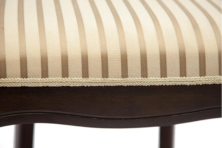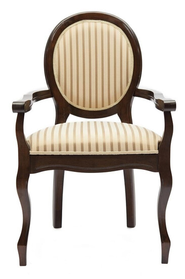 Классическое кресло с деревянным каркасом и мягкими сиденьем и спинкой. Комфортная посадка. Для изготовления кресло использовано дерево гевеи, прочное и стойкое к воздействиям окружающей среды. Обивка сиденья и спинки кресла выполнена из ткани в полоску.
