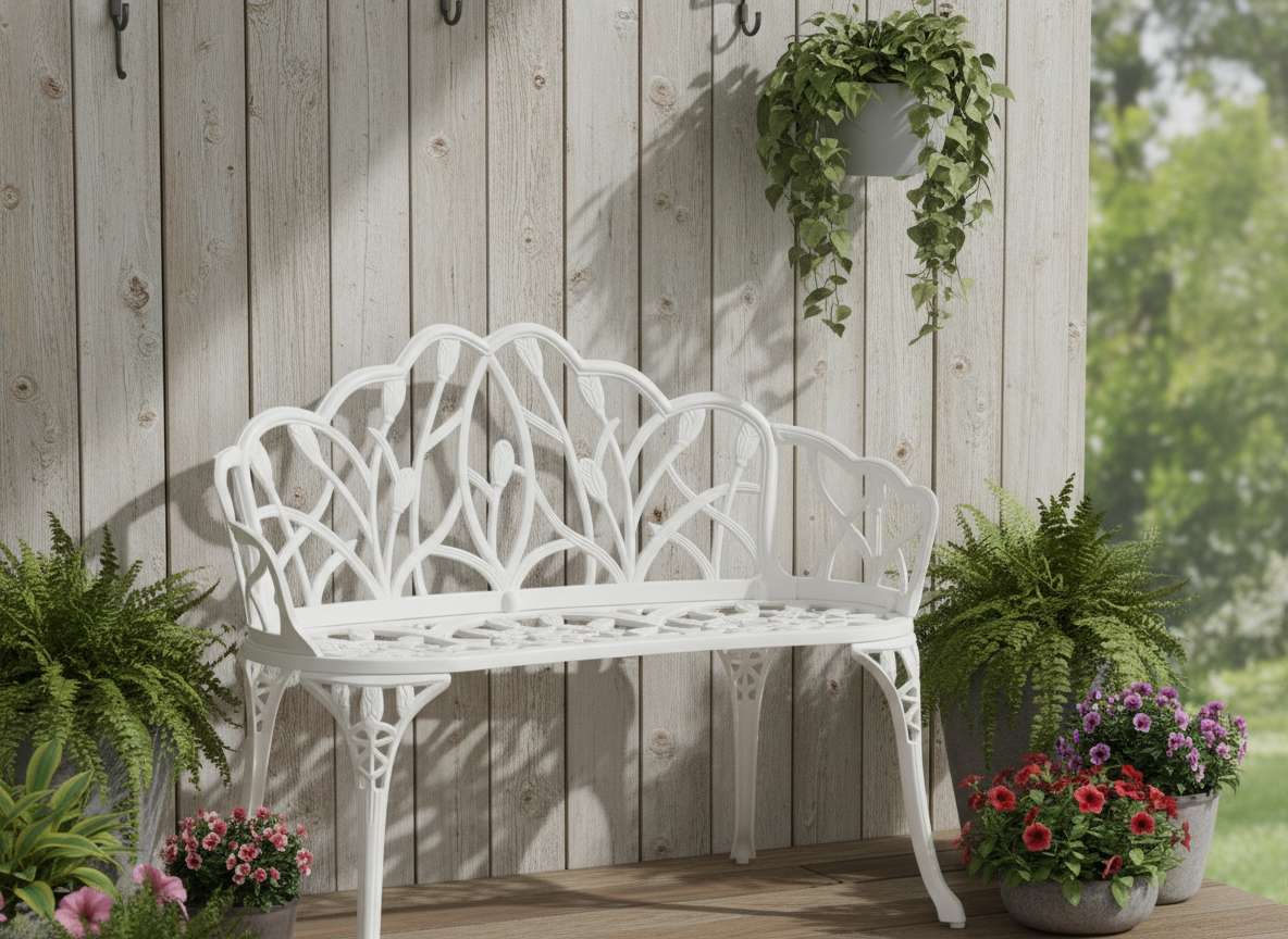 Уникальные кованые цветочные узоры, напоминающие тонкое кружево, придают модели особую декоративность и шарм. В сочетании с прочным каркасом из литого алюминия скамья выглядит дорого и элегантно, гармонично вписываясь как в классический, так и в современный ландшафтный дизайн.