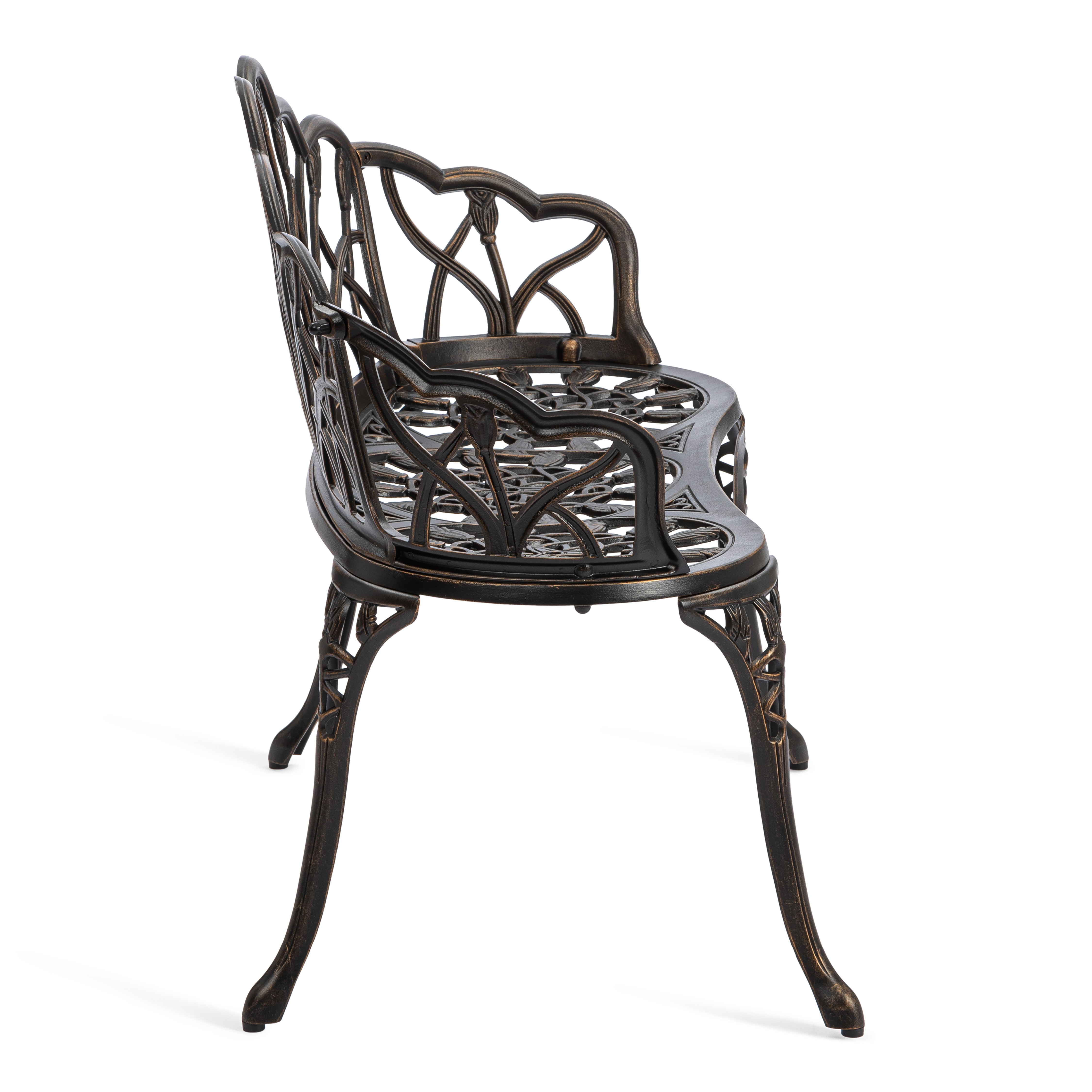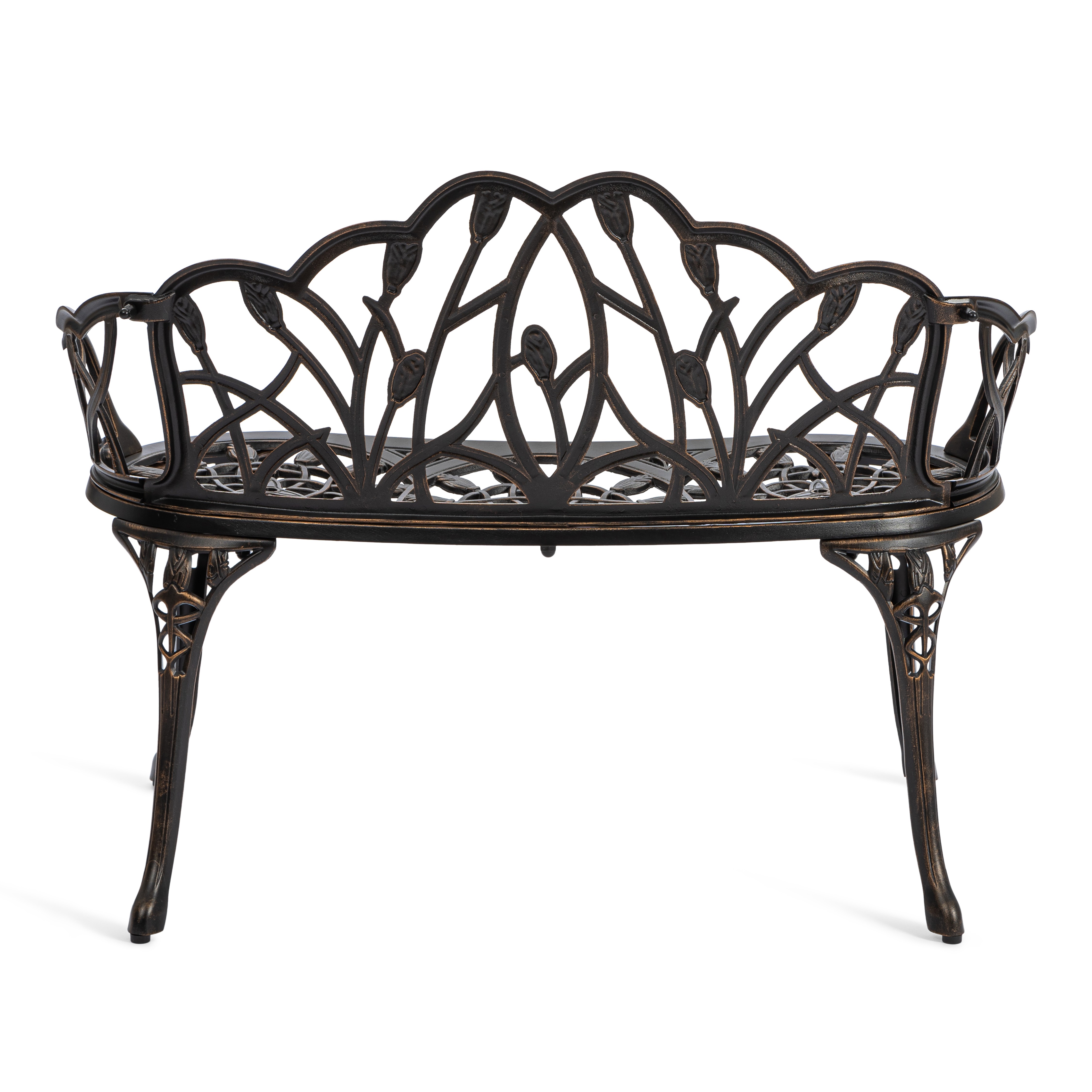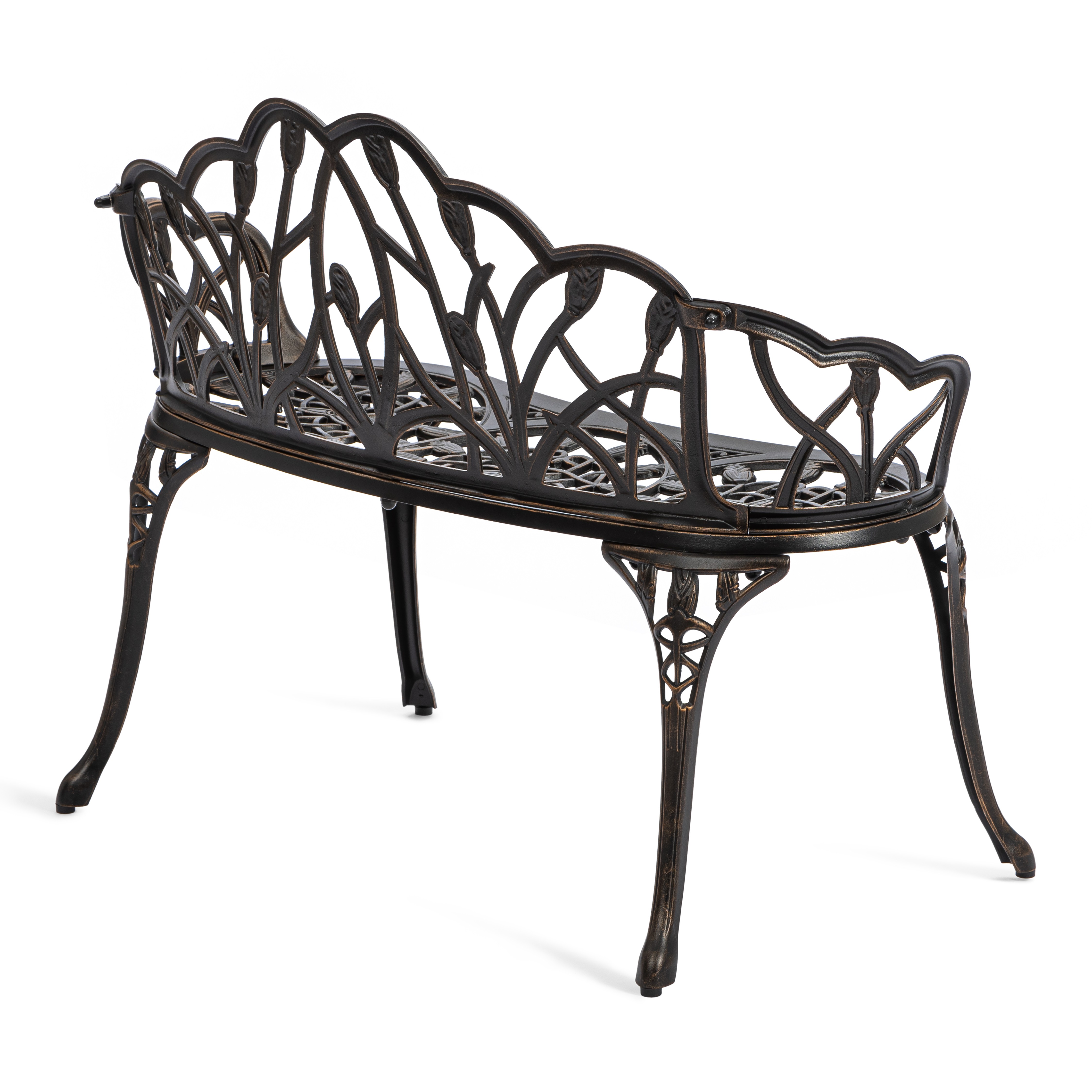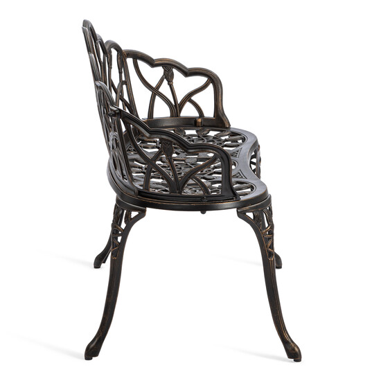 Уникальные кованые цветочные узоры, напоминающие тонкое кружево, придают модели особую декоративность и шарм. В сочетании с прочным каркасом из литого алюминия скамья выглядит дорого и элегантно, гармонично вписываясь как в классический, так и в современный ландшафтный дизайн.