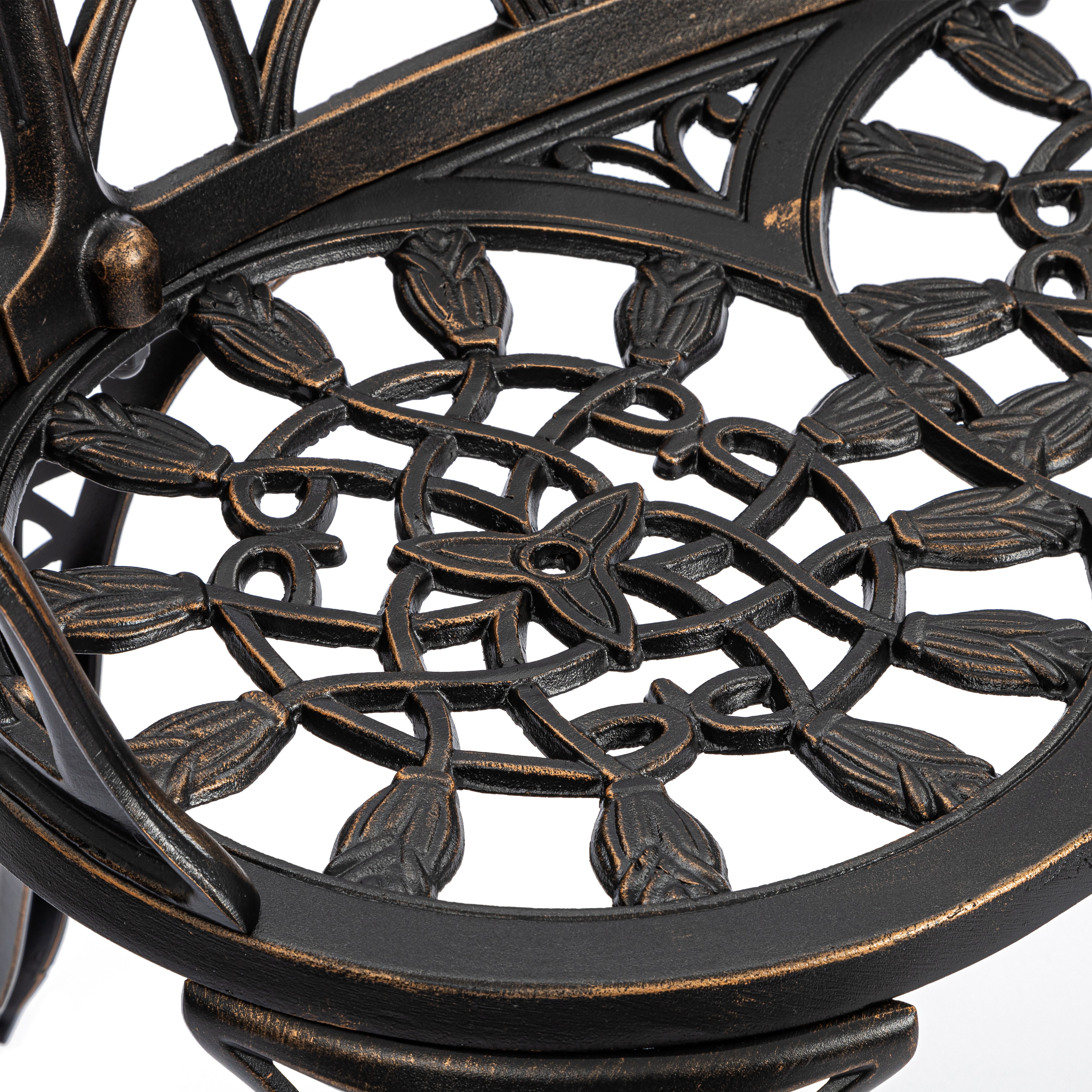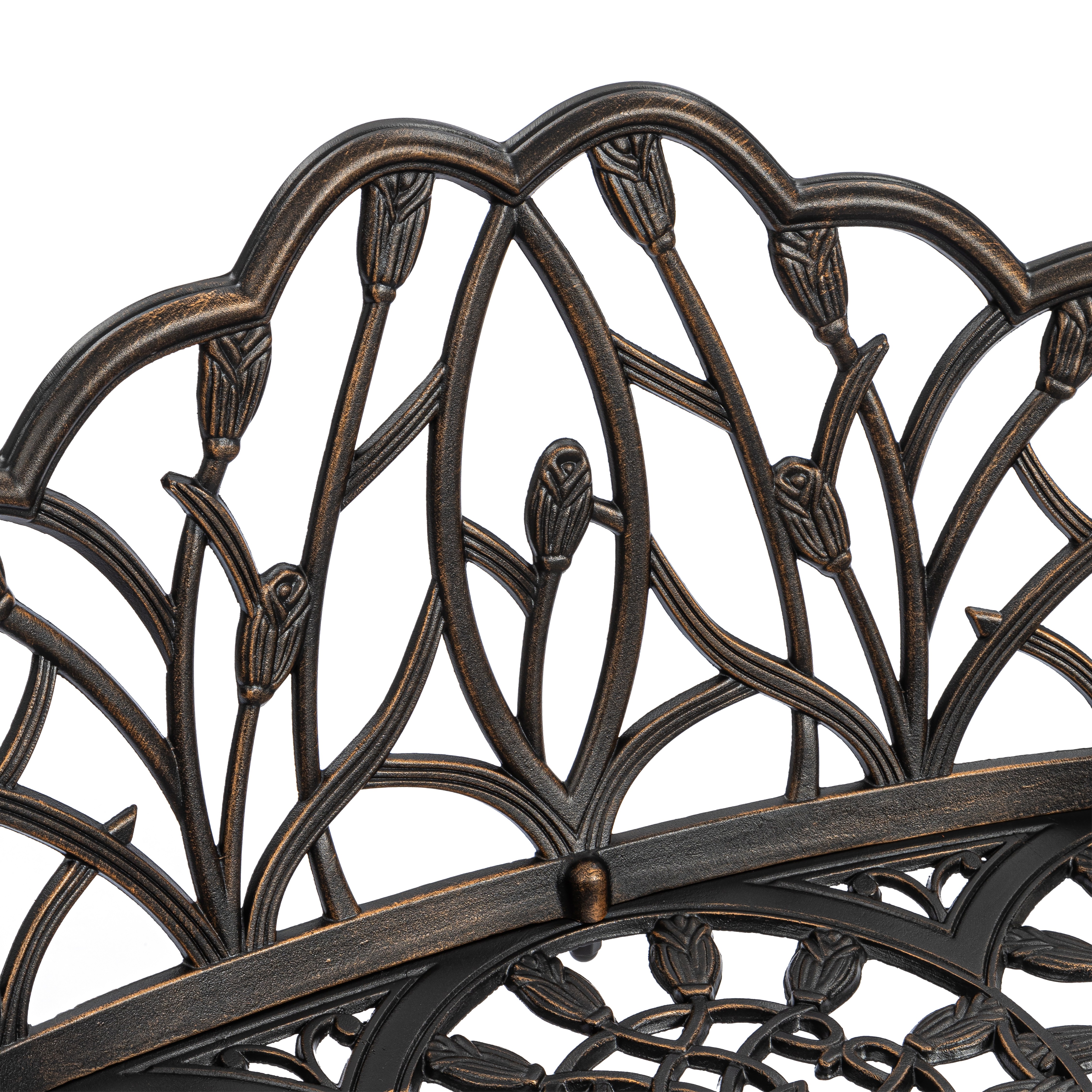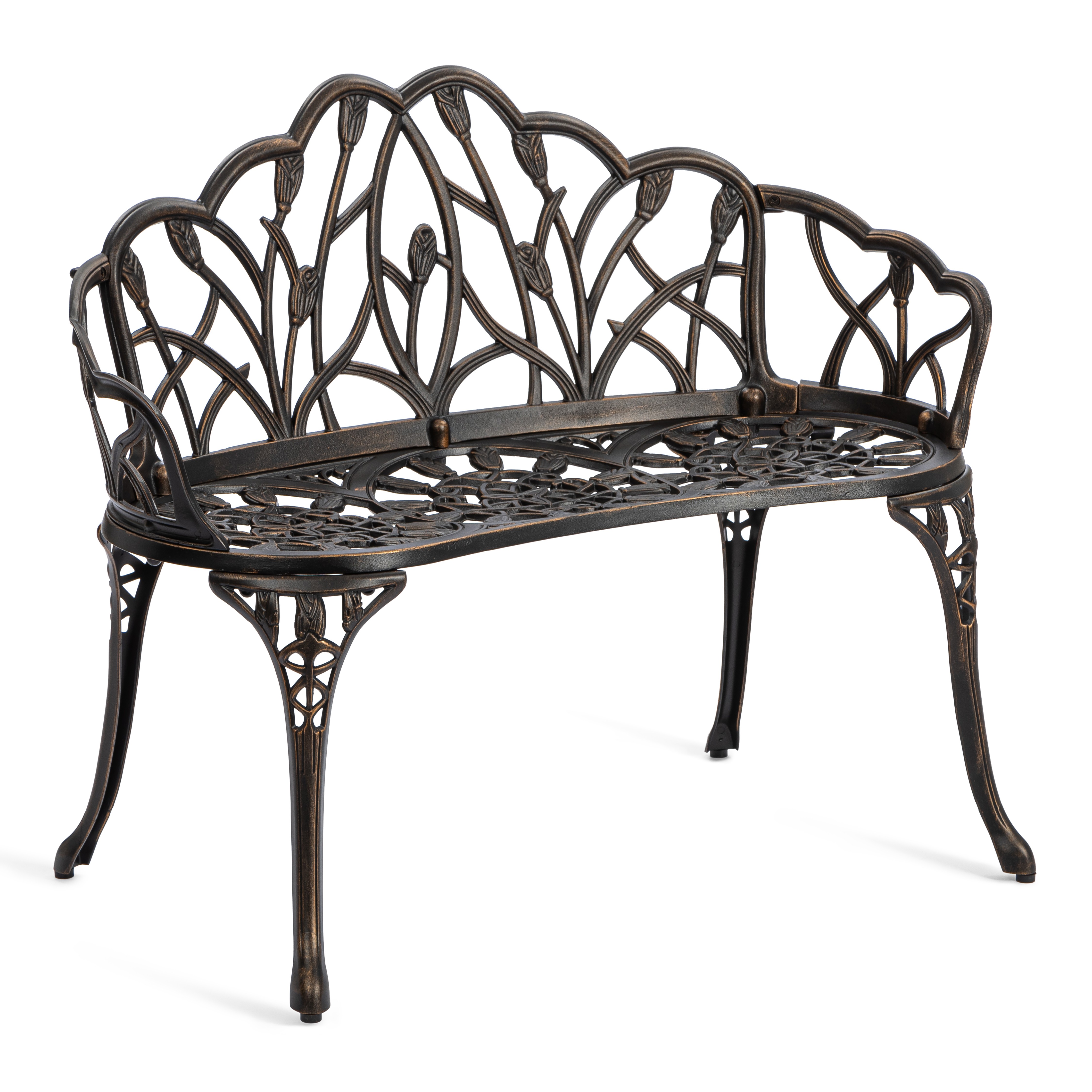 Уникальные кованые цветочные узоры, напоминающие тонкое кружево, придают модели особую декоративность и шарм. В сочетании с прочным каркасом из литого алюминия скамья выглядит дорого и элегантно, гармонично вписываясь как в классический, так и в современный ландшафтный дизайн.