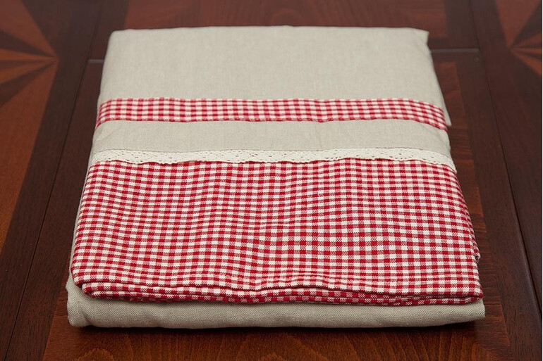 Красивый текстиль творит чудеса ― он приносит в наш дом новые краски, индивидуальность и уют, он способен без особых усилий полностью преобразить пространство. В коллекциях Secret de Maison представлен большой выбор интерьерного и столового текстиля из натуральных тканей в стиле прованс. Каждая коллекция решена в одном цветовом решении и единой стилистике. Вы без труда подберете гармонирующие друг с другом скатерть, гардины или декоративные подушки. В коллекции «Country Kitchen» представлены скатерти, кухонные полотенца, фартуки, салфетки, прихватки, подушки на стул и занавески. Скатерть «Country Kitchen» из однотонного натурального хлопка отделана хлопковым кружевом ручной работы и широким контрастным кантом в мелкую клетку с набивным рисунком. В декоре использован традиционный для прованса растительный орнамент.