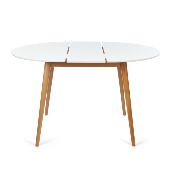 Стильный обеденный стол BOSCO из Датской коллекции отлично дополнит интерьер загородного дома, городской квартиры, кухни, гостиной, кафе или ресторана. Удачное сочетание столешницы, покрашенной в белый цвет, и визуально легких ножек цвета натурального дерева выглядит стильно и привлекательно. Обеденный стол BOSCO хорошо впишется в любой современный интерьер. Модель имеет основательный раздвижной механизм, который позволит разместить с комфортом всю вашу семью. Круглая форма столешницы помогает создать свободную и легкую атмосферу в комнате, способствует спокойному и приятному общению. Изящные тонкие ножки изготовлены из натуральной экологически чистой древесины ─ массива бука. Столешница из МДФ со шпоном бука и глянцевым напылением не требует специального ухода, выдерживает воздействие жидкости и тепла. Стол поставляется в разобранном виде, необходима несложная сборка по инструкции.