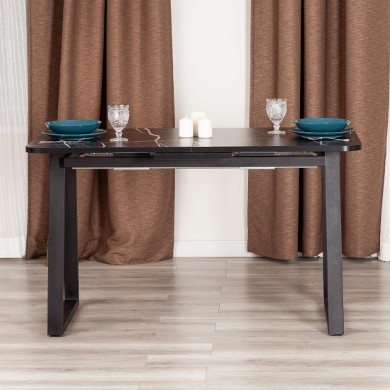 Необычный раскладной стол MALTIDO из коллекции Modern сделает оригинальным и узнаваемым интерьер загородного дома или городской квартиры. Необычная форма ножек придаст любому помещению особую индивидуальность и привлекательность. Стол подойдёт гостиной, кухни или столовой. Столешница в цвете мрамор черный и вставка выполнены из ЛДСП толщиной 22 мм на лицевую поверхность которых нанесен защитный слой HPL толщиной 1 мм. HPL имеет защитное покрытие оверлей высокой степени истирания, которое повышает устойчивость поверхностей к повреждениям. Для увеличения размера стола используется автоматический механизм подъема вставки стола. Прочные черные металлические ножки окрашены порошковой краской. Опоры укомплектованы регулировочными винтами, для выравнивания стола на неровных поверхностях. Столешница снабжена фиксаторами. Во избежании самопроизвольного раздвижения половинок столешниц обязательно переключайте фиксаторы в состояние "Закрыто". Стол будет радовать своего владельца долгим сроком службы, надежностью, устойчивостью, привлекательностью, удивит своей красотой и изысканностью даже самых требовательных хозяев. За столом могут разместиться от 2 до 6 человек. Стол упакован в транспортировочный короб из ЛДСП + гофрокороб. Модель проста в сборке, инструкция прилагается.