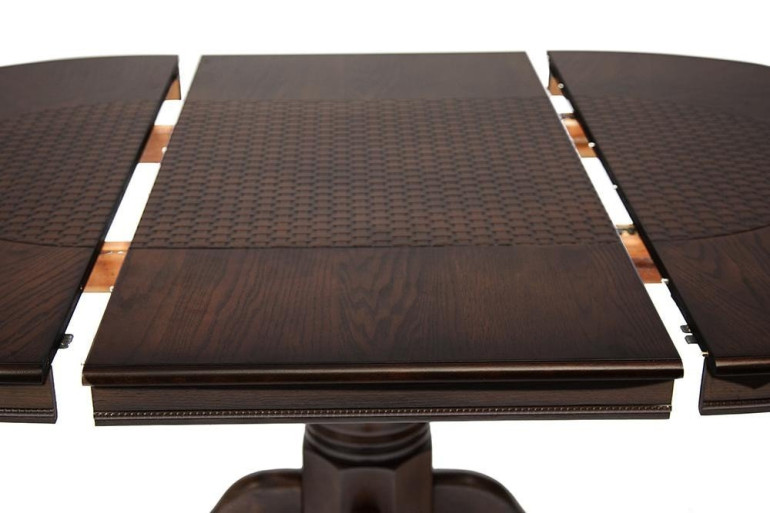 Обеденная коллекция деревянных столов с тремя вариантами декоративного функционального покрытия столешницы из мдф: «ротанг», «камень» и «кожа крокодила». Узор выполнен вручную. Вы можете разместить за столом до 8-ми персон одновременно, благодаря раскладному механизму.