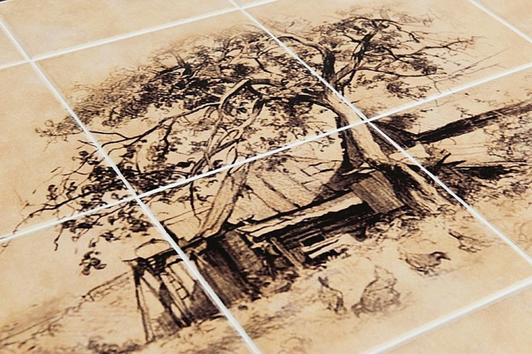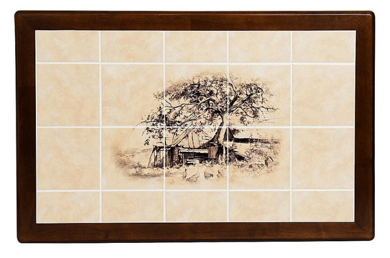 Обеденный стол из дерева гевеи в цвете антик со столешницей из керамической плитки. Гевея произрастает во влажных тропические лесах. Поэтому кухня, с ее устойчивой влажностью и высокими температурами, не способна нанести вред мебели из данной породы дерева. Из гевеи, к слову, производят и кухонную посуду. Помимо прочной, долговечной основы, стол обладает и другими плюсами. Расписная керамическая столешница позволяет разместить на столе горячую посуду без страха за столешницу.