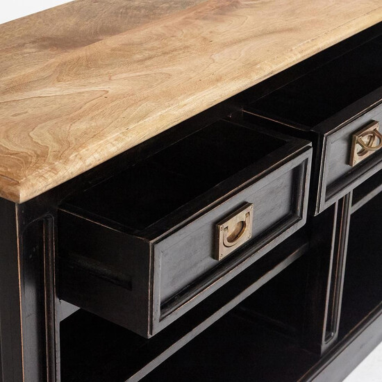 Классическая тумба Secret De Maison соединила в себе лучшие черты французского стиля. Винтажная фурнитура, прочный каркас из массива акации, покрашенный в черный цвет, выдвижные ящики и открытые полки ― эта элегантная и функциональная модель станет любимым предметом интерьера в вашем доме. Светлая столешница из массива манго, обработанная натуральным маслом, прочна, надежна и не требует сложного ухода. Модель отлично гармонирует с мебелью из серии BLACK LABEL. Поставляется в собранном виде.